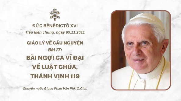 Trong buổi Tiếp kiến chung sáng thứ Tư ngày 09.11.2011, Đức Giáo hoàng Bênêđictô XVI tiếp tục trình bày loạt bài giáo lý về cầu nguyện với bài thứ 17: Bài ngợi ca vĩ đại về Luật Chúa, Thánh vịnh 119. Theo Đức Giáo hoàng, Luật Chúa là đối tượng tình yêu say mê của Vịnh gia và của tất cả mọi tín hữu, là suối nguồn sự sống. Ước mong hiểu biết, tuân giữ và hướng tới Luật Chúa là đặc thái cung cách sống của người công chính và trung thành với Thiên Chúa. Sau đây là toàn văn bài giáo lý của Đức Giáo hoàng.