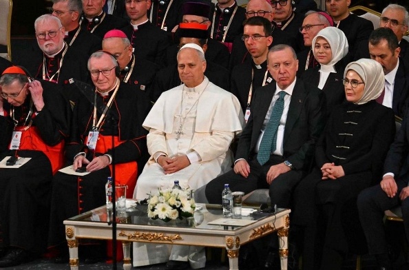 ĐGH Lêô XIV bên cạnh Tổng thống Thổ Nhĩ Kỳ Tayyip Erdogan và Phu nhân Emine, ngày 27.11.2025 (AFP or licensors)