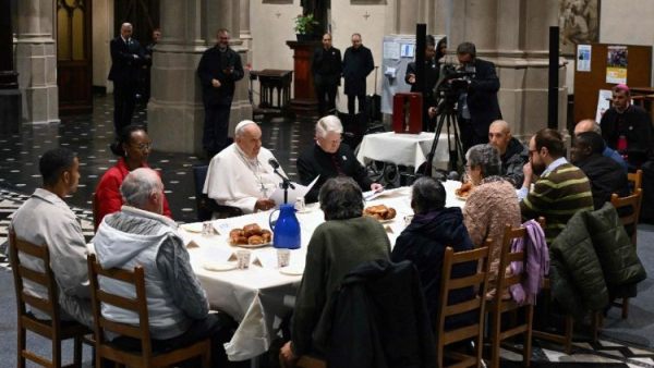 Đức Giáo hoàng Phanxicô dùng bữa sáng với người vô gia cư tại giáo xứ Thánh Gilles, Brussels - Bỉ, ngày 28.09.2024 (AFP or licensors)
