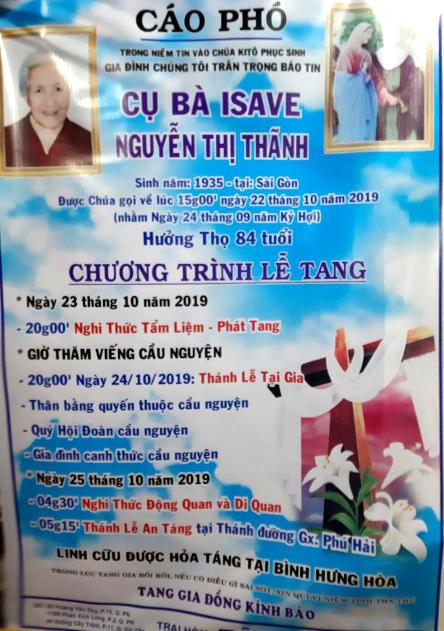 Đã được Chúa gọi về lúc 15g ngày 22.10.2019 (nhằm ngày 24 tháng 09 năm Kỷ Hợi)
