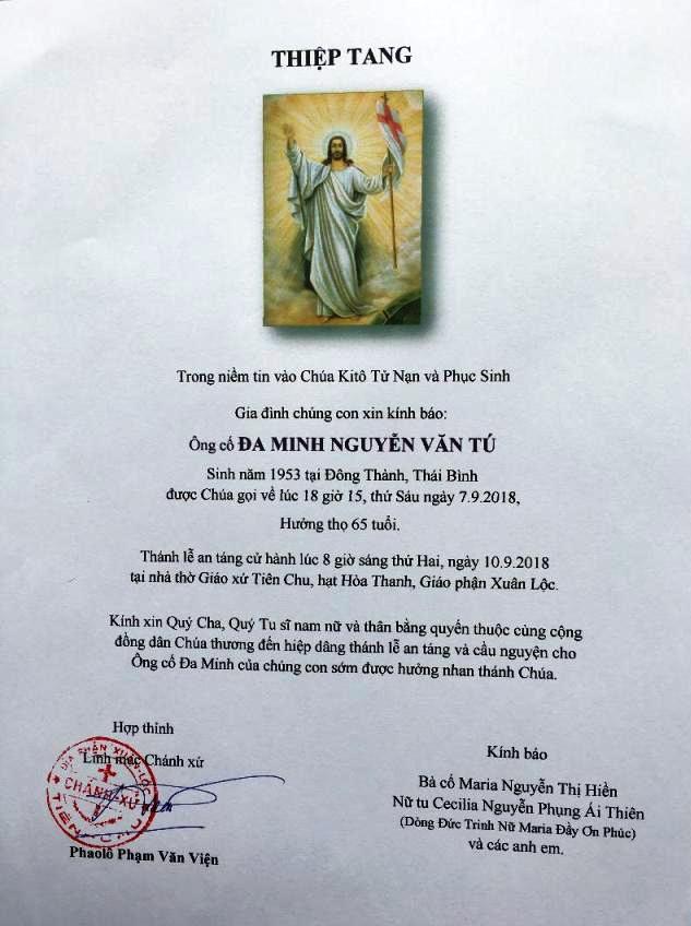 Cáo phó: Ông cố Đaminh Nguyễn Văn Tú (thân phụ nữ tu Cecilia Nguyễn Phụng Ái Thiên)