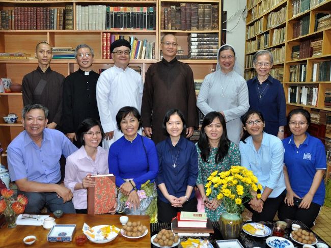 Từ trái sang, hàng đứng: thầy Thích Không Hạnh, linh mục Phanxicô Xaviê Bảo Lộc, đạo hữu Huệ Khải, thầy Văn Quang, nữ tu Maria Nguyễn Thị Ngọc Lan (Dòng Phan Sinh Thừa Sai Đức Mẹ), nữ tu Paula Tăng Ngọc Điệp (Dòng Đức Bà).