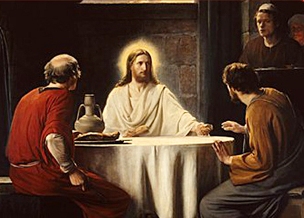 Ðang khi cùng các ông ngồi bàn, Người cầm bánh, đọc lời chúc tụng, bẻ ra và trao cho hai ông. Mắt họ sáng ra và nhận ra Người. Ðoạn Người biến mất. Họ bảo nhau: Phải chăng lòng chúng ta đã chẳng sốt sắng lên trong ta, khi Người đi đường đàm đạo và giải thích Kinh Thánh cho chúng ta đó ư? Ngay lúc ấy họ chỗi dậy trở về Giêrusalem, và gặp mười một tông đồ và các bạn khác đang tụ họp. Họ bảo hai ông: Thật Chúa đã sống lại, và đã hiện ra với Simon. Hai ông cũng thuật lại các việc đã xảy ra dọc đường và hai ông đã nhận ra Người lúc bẻ bánh như thế nào.