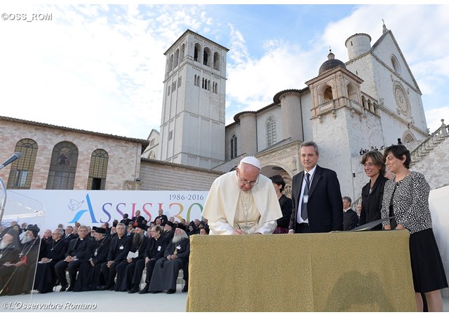 Là những người nam và người nữ thuộc nhiều tôn giáo khác nhau, chúng tôi quy tụ ở thành phố của Thánh Phanxicô, như những người hành hương. Ba mươi năm trước, vào năm 1986, các đại diện tôn giáo từ khắp nơi trên thế giới đã gặp nhau ở đây theo lời mời của Đức Giáo hoàng Gioan Phaolô II. Đó là lần đầu tiên có một cuộc quy tụ long trọng nhiều người như thế, để khẳng định rằng mối liên hệ giữa thiện ích lớn lao của hoà bình và sự dấn thân đích thực của tôn giáo là không thể tách rời. Từ sự kiện lịch sử ấy, đã khơi mào một cuộc hành hương kéo dài, qua nhiều thành phố trên thế giới, đưa nhiều tín hữu vào cuộc đối thoại và cầu nguyện cho hoà bình. Nó đã đem mọi người đến với nhau mà không phủ nhận sự khác biệt của họ, tạo nên tình hữu nghị liên tôn đích thực và góp phần vào việc giải quyết nhiều cuộc xung đột. Đây là tinh thần đã thúc đẩy chúng tôi: gặp gỡ qua đối thoại, chống lại mọi hình thức bạo lực và lạm dụng tôn giáo để biện minh cho chiến tranh và khủng bố. Dẫu vậy, trong những năm qua, nhiều dân tộc vẫn còn đau khổ vì chiến tranh. Người ta đã không luôn hiểu được rằng chiến tranh tàn phá thế giới, để lại di sản đau thương và thù hận. Trong chiến tranh, mọi người đều thua, kể cả kẻ thắng cuộc.