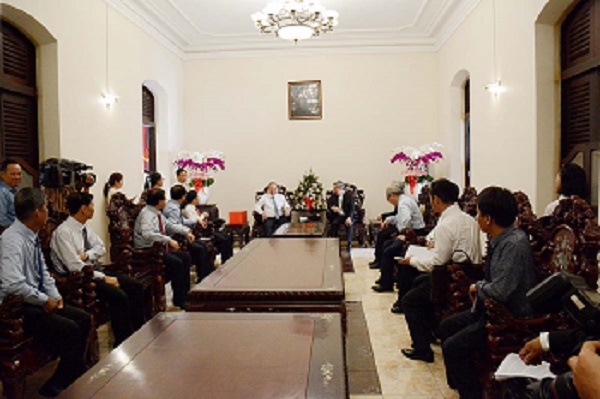 Tiếp đón phái đoàn tại phòng khách Tòa Giám mục có Đức Tổng Giám mục (TGM) Giuse Nguyễn Năng, ĐGM Louis Nguyễn Anh Tuấn, linh mục (Lm) Ignaxiô Hồ Văn Xuân, Lm Giuse Đào Nguyên Vũ và Lm Phêrô Kiều Công Tùng.
