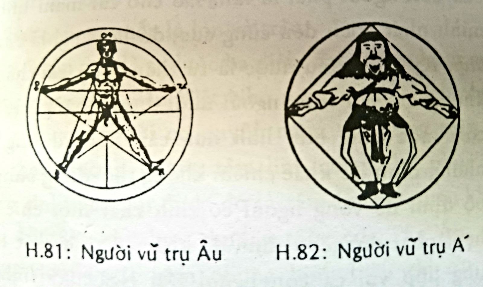 Hãy xét một mẫu truyện lấy trong việc có liên hệ với lúc xuất hiện của con người đó là lối tính tuổi. Khi nói tôi sinh ra năm Giáp Dần thì câu đó đã hàm chứa trọn vẹn quan niệm lưỡng thê về con người rồi, tức động mà tĩnh, tĩnh mà động. Sự vụ như sau: chữ Giáp là thiên căn chỉ đức trời (tròn), chữ Dần chỉ đức đất (vuông). Hai đàng tròn vuông được lồng vào nhau làm nên những nét đặc trưng cực kỳ quan trọng mà xưa rày ít được chú ý nên cần được vẽ như lược đồ sau:
