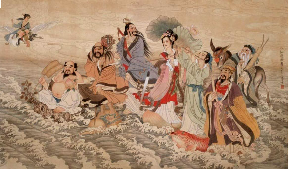 Người ta tin rằng có ba nhân vật lịch sử và năm nhân vật huyền thoại là đã đạt được tính bất tử có tên tuổi nổi bật trong truyền thuyết tôn giáo Trung Hoa. Các nguồn tài liệu Đạo giáo nói tới nhiều vị tiên đạt được tính bất tử, nhưng tám vị này là quan trọng nhất. Truyền thuyết tôn giáo Trung Hoa chứa đựng nhiều bộ tám (ví dụ: các hào đồ, báu vật, phương hướng vũ trụ). Các vị Tiên (xian) có phần tương đồng với các vị thánh của Kitô giáo và các bạn hữu của Thượng Đế của Hồi giáo. Lã Động Tân (Lu Dong Bin), nguyên thủy là một tổ sư của trường phái Toàn Chân trong thế kỷ thứ VIII, thường dẫn đầu nhóm. Ông thường ăn mặc như một học giả và mang một cái chổi đuổi ruồi. Một số hình ảnh trình bày ông cầm thanh kiếm thần, một trong Tám Biểu Tượng Đạo giáo. Lã là vị bảo trợ của thợ cắt tóc và được ca tụng về khả năng chữa bệnh. Lý Thiết Quài (Li Tei Guai) một nhân vật huyền thoại thuần túy có biểu tượng là trái bầu và cái nạng, xuất hiện như một người ăn xin cà nhắc. Ông bênh vực kẻ thân cô thế cô và là vị bảo trợ các y sĩ. Trương Quả Lão (Zhang Guo Lao) sống vào khoảng giữa năm 650 và 750 Công nguyên, có khả năng tàng hình, ông xuất hiện đang cỡi (thường ngồi ngược!) trên chiếc xe tơ trắng mà ông có thể cuốn lại và nhét vào tay áo. Biểu tượng của ông là một nhạc cụ gõ được làm bằng ống trúc và hai cây gậy và ông là đấng bảo trợ các cụ cao niên.