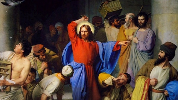 Lễ Vượt Qua của dân Do Thái gần đến, Chúa Giêsu lên Giêrusalem; Người thấy ở trong đền thờ có những người bán bò, chiên, chim câu và cả những người ngồi đổi tiền bạc. Người chắp dây thừng làm roi, đánh đuổi tất cả bọn cùng với chiên bò ra khỏi đền thờ, Người hất tung tiền của những người đổi bạc, xô đổ bàn ghế của họ, và bảo những người bán chim câu rằng: “Hãy đem những thứ này đi khỏi đây, và đừng làm nhà Cha Ta thành nơi buôn bán”. Môn đệ liền nhớ lại câu Kinh Thánh: “Sự nhiệt thành vì nhà Chúa sẽ thiêu đốt tôi”.