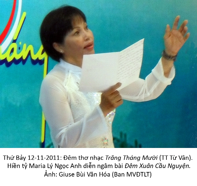 Ban MVĐTLT và khoảng ba mươi học viên khóa Thực Hành Đối Thoại Liên Tôn tại Học Viện Mục Vụ Tổng Giáo Phận đã hoan hỷ đến với đêm thơ nhạc này. Hòa chung niềm vui cùng các đạo hữu Cao Đài, hiền tỷ Maria Lý Ngọc Anh (Thư Ký của Ban MVĐTLT) diễn ngâm bài 'Đêm Xuân Cầu Nguyện' của thi sĩ Hàn Mạc Tử (1912-1940); các Kitô hữu đồng ca bài 'Mở Rộng Con Tim' của hiền huynh Giu-se Bùi Văn Hóa (Phó Ban MVĐTLT).